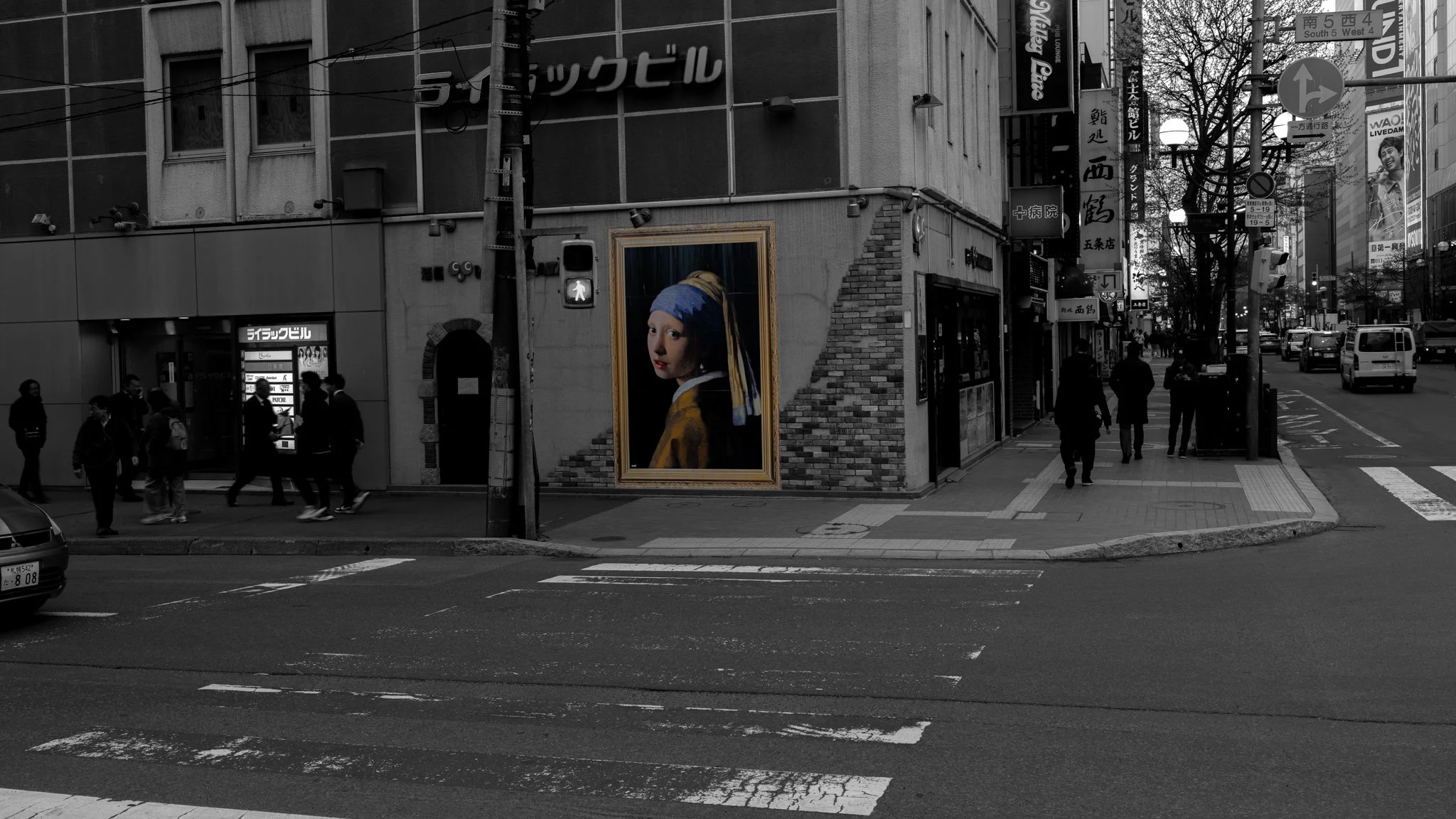 girl with a pearl earring on in susukino, sapporo. i really lkike experimenting with color in photos, and this one was really fun to do. sometimes i like to selectively remove all the colors except one or two from an image, but this one made it so easy to decide how to do it.