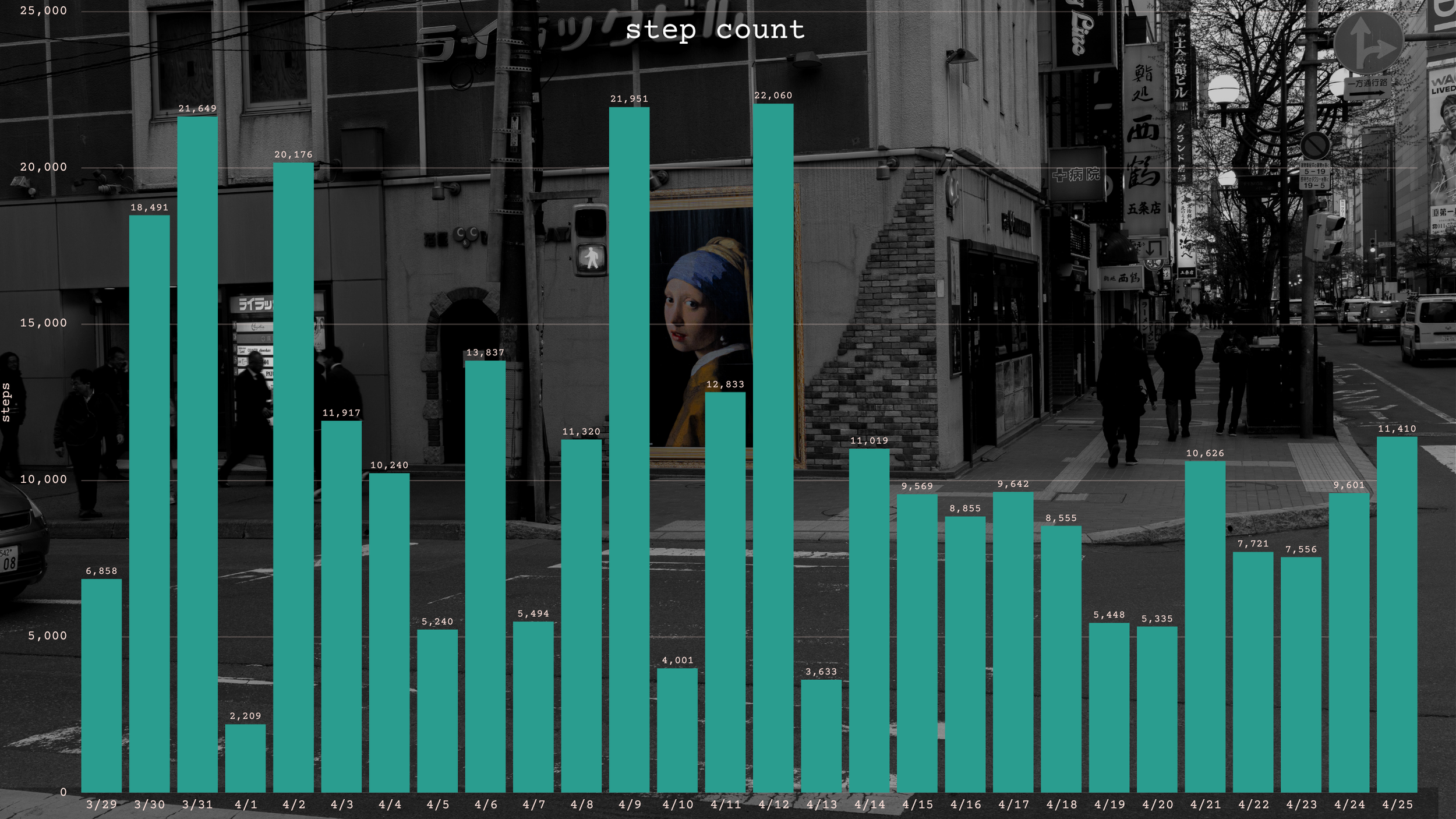 this one surprised me, if only because i did over 100k steps in tokyo alone. i spent a combined total of 8 days in tokyo. but the 1st, 3rd, and 5th highest step count days (4/12, 3/31, 3/30) were all in tokyo, which really skews the statistic. just those 3 days alone were 62k steps.