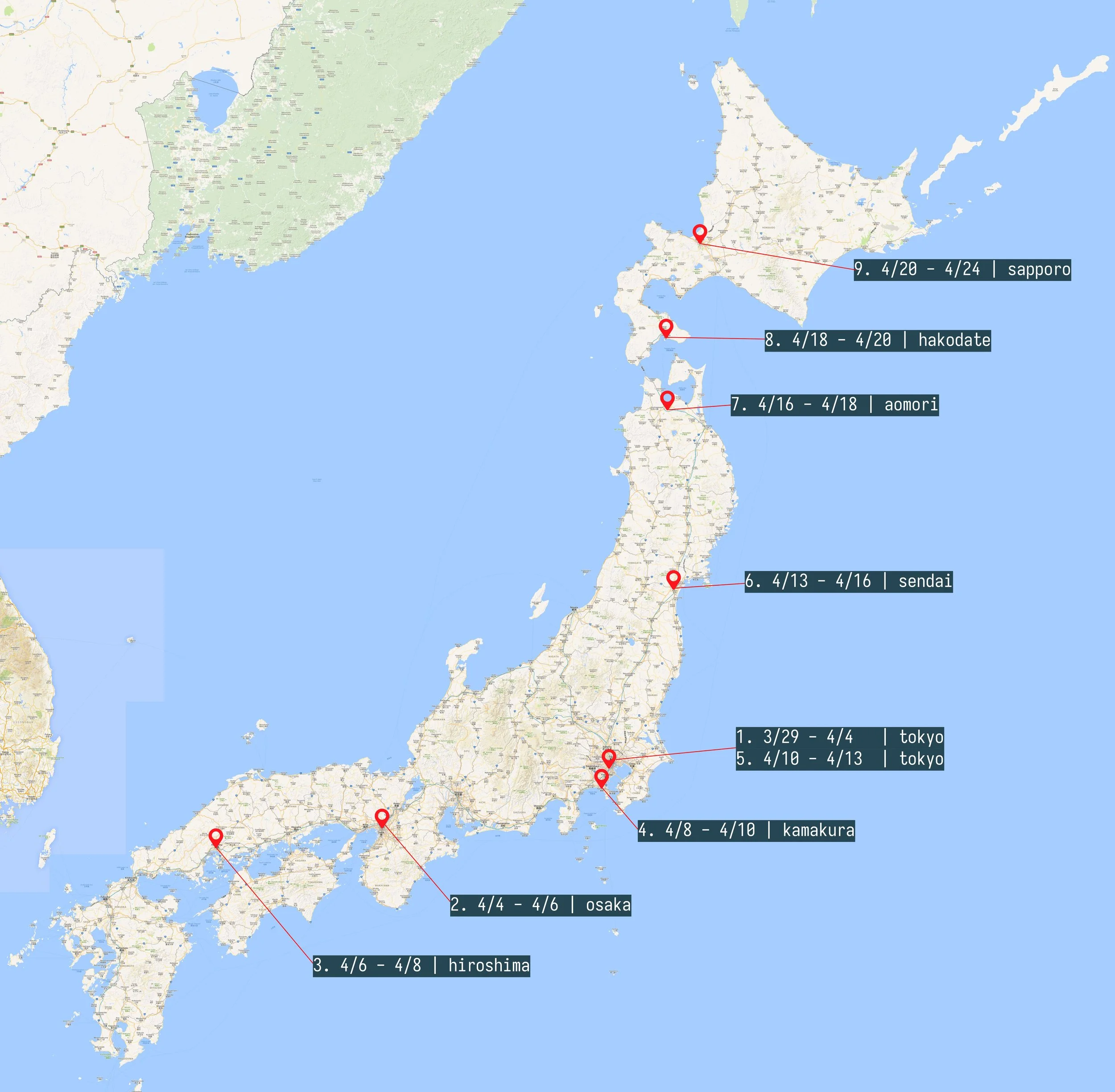 hello again, one year later. i’ve got the trip planned out now! i will be visiting a bunch of cities this time, the most i have ever done in one trip (sorta). I stayed in 8 different cities last time (actually visited 10). this time, i will be staying in 8 different cities, but i have broken up the tokyo bit into two separate stops. i did this because 2 friends will be joining me for the first 9 days of the trip this time. while i have historically spent 2 weeks in tokyo at the start of my trips, the other travelers understandably want to see more than just tokyo. so, i will start in tokyo for a few days, then do a sort of (compared to my typical pace) “speedrun” of the golden route. we are going to try to fit tokyo (including the obligatory day trip to nagano for the monkeys), osaka (+kyoto and perhaps also +nara), and hiroshima into those 9 days. by my standards, that is breakneck pace.