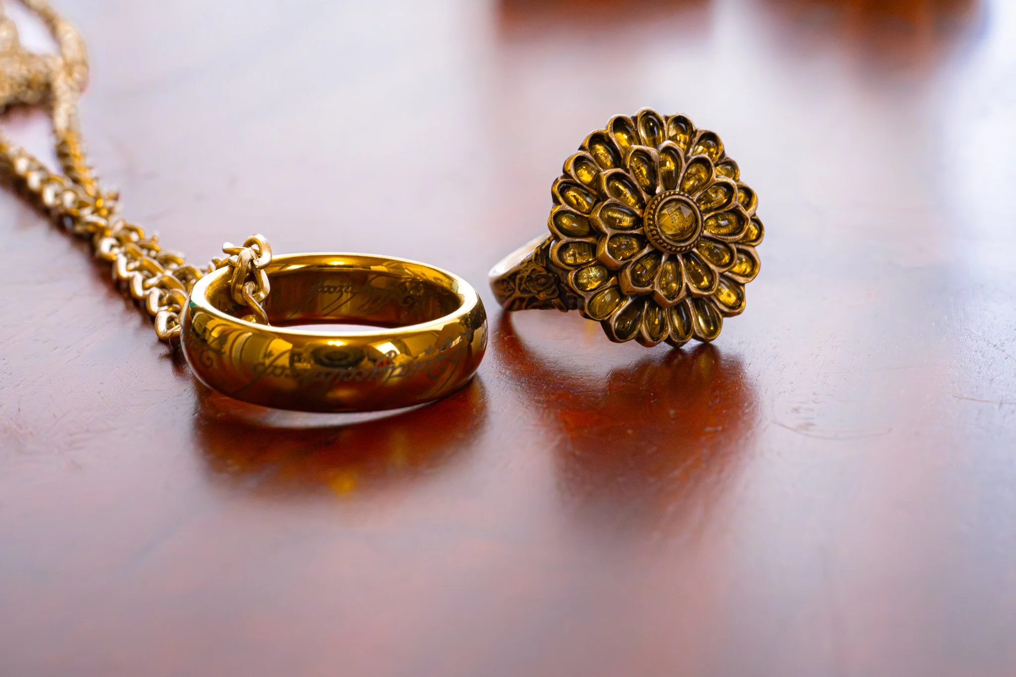 nerdiest picture i will ever take, the one ring and a ring from dark souls. its a really beautiful ring, and its kind of expensive - ¥36,000, or about $210. they have to hand cut 33 peridot stones to fit into each little slot. but hey, it will make my stamina regenerate faster, so its worth it.