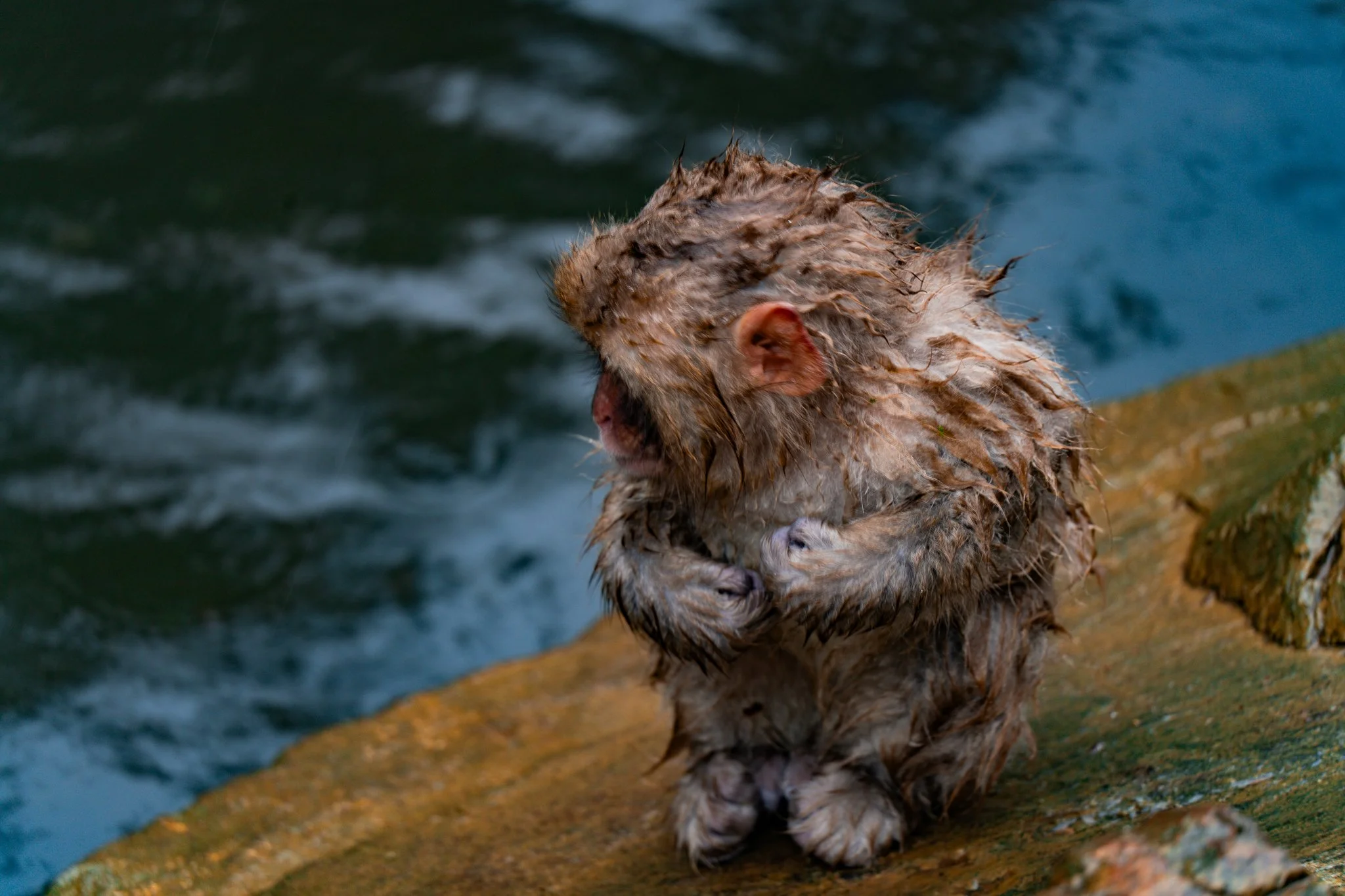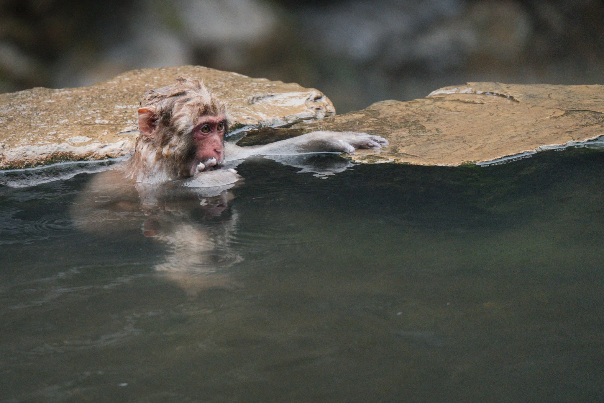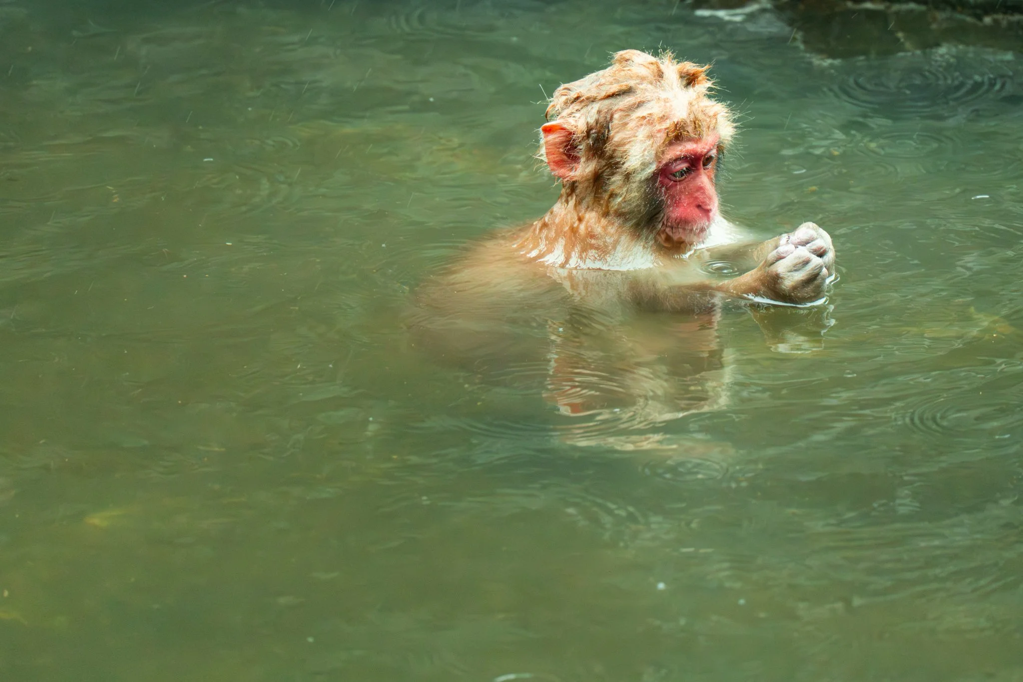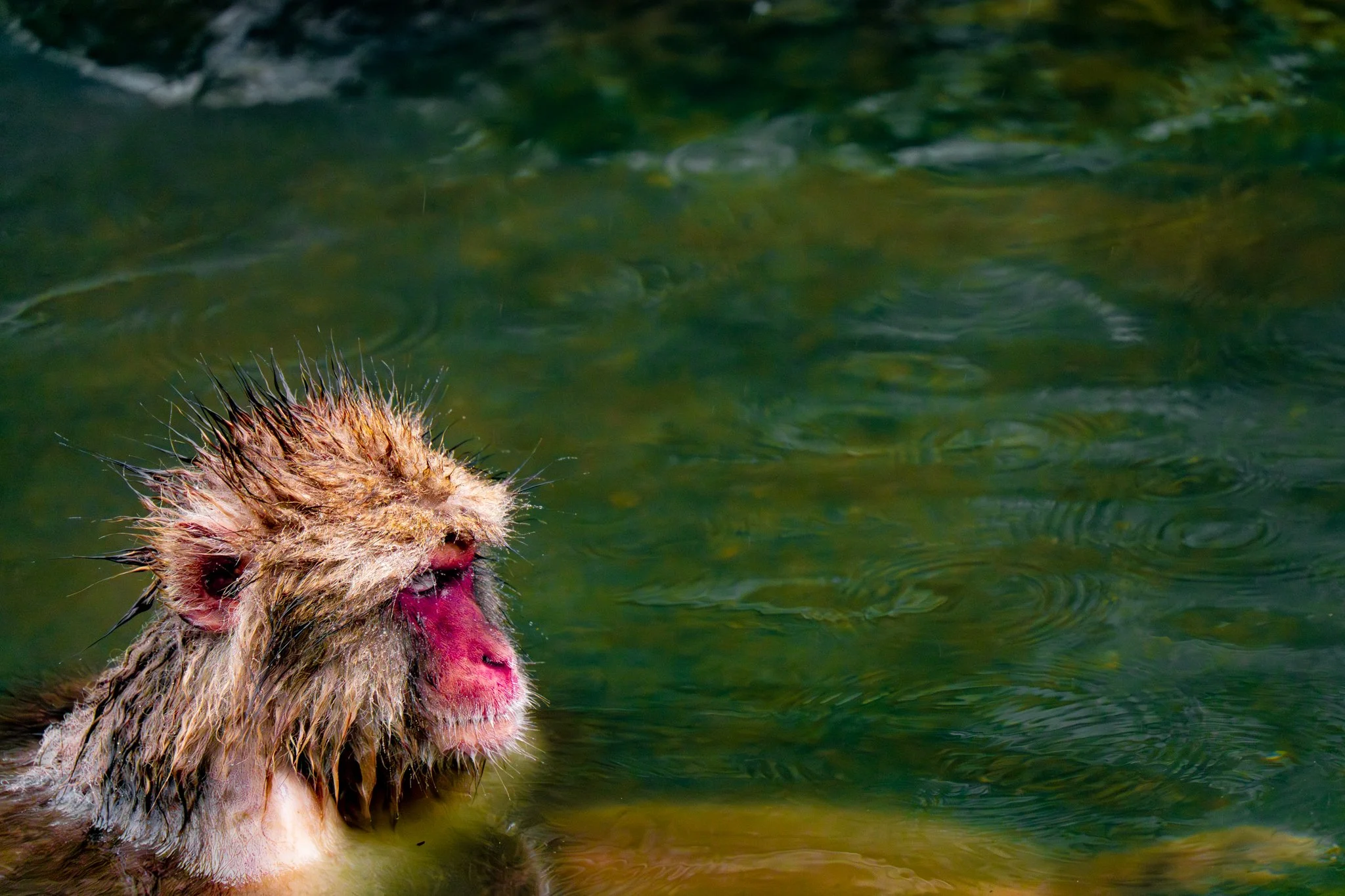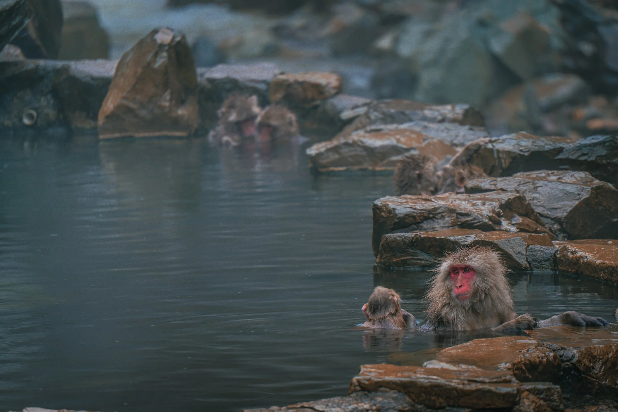 there were far far fewer monkeys this year than there have been the previous years. i would say there were around 20 or 25 monkeys there. but they were almost all in the hot spring this time, because it was so cold. and there were a couple very tiny precious baby monkeys, because apparently they give birth in the early spring.