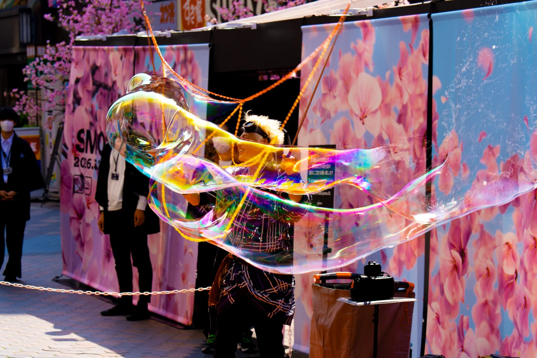 while the gang went in there, i went for a walk down the nearby street. they had a popup temporary smoking section in the middle of the street, being used as marketing for ploom, a “heated tobacco” product. they are super popular in japan as an alternative to cigarettes. its a little electronic heating device that you put sticks that look like cigarettes into. it produces very little smoke and is nearly odorless. they had a guy outside blowing bubbles to get people’s attention, and i ended up getting an amazing photo out of it. i went inside the smoking area, and its just a small table with someone giving out free samples and trying to convince people to buy one. so i tried out the ploom heated cigarette thing. it kinda sucks. dont smoke.